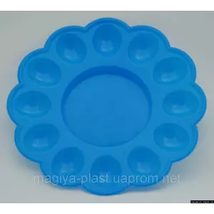 Пасхальная пластмассовая фигурная тарелка-подставка на 12 яиц и праздничный кулич изготовлена из смеси на базе полипропилена, и предназначена для использования в качестве кухонной утвари. Диаметр внутренней ячейки около 11см, соответственно изделие подходит для использования как подставка для кулича-паски до Ø11см, и дюжины пасхальных крашеных яиц (писанок) по краям. Изделие, благодаря своему специальному дизайну, так же, подходит для подачи других блюд из яиц.