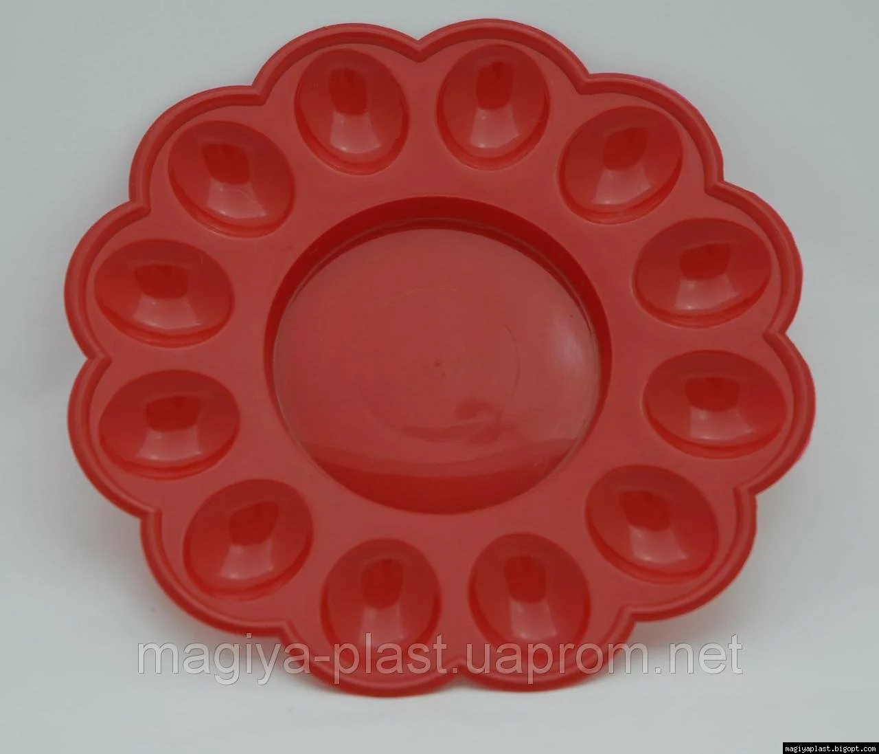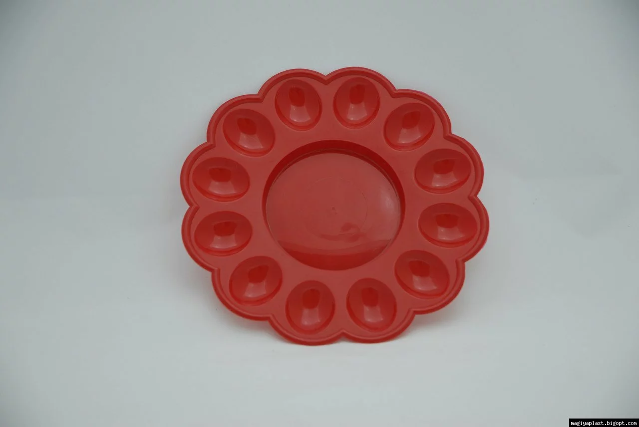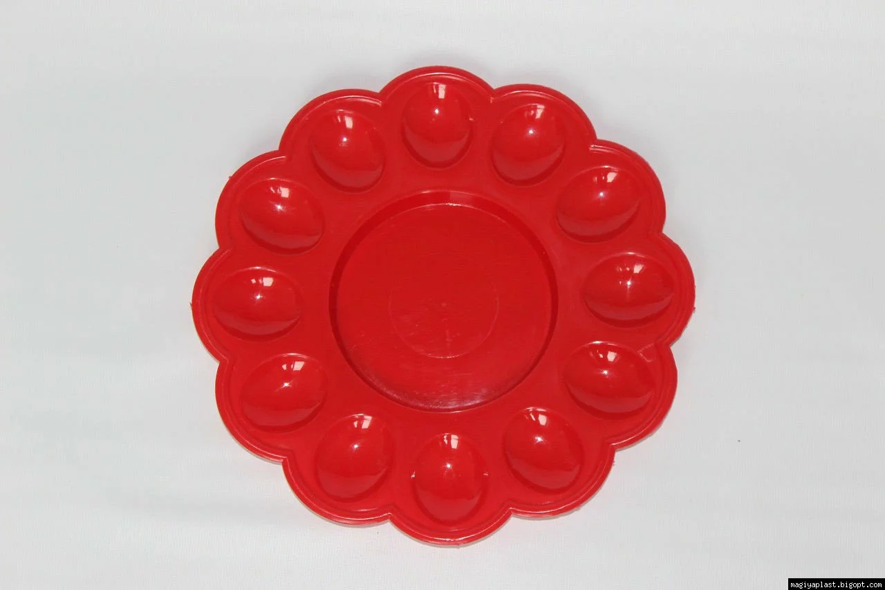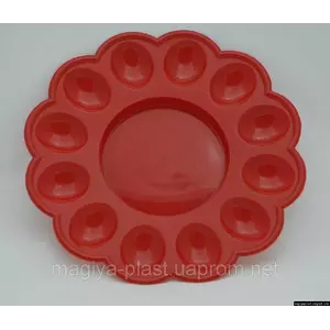 Пасхальная пластмассовая фигурная тарелка-подставка на 12 яиц и праздничный кулич изготовлена из смеси на базе полипропилена, и предназначена для использования в качестве кухонной утвари. Диаметр внутренней ячейки около 11см, соответственно изделие подходит для использования как подставка для кулича-паски до Ø11см, и дюжины пасхальных крашеных яиц (писанок) по краям. Изделие, благодаря своему специальному дизайну, так же, подходит для подачи других блюд из яиц.