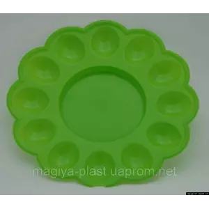 Пасхальная пластмассовая фигурная тарелка-подставка на 12 яиц и праздничный кулич изготовлена из смеси на базе полипропилена, и предназначена для использования в качестве кухонной утвари. Диаметр внутренней ячейки около 11см, соответственно изделие подходит для использования как подставка для кулича-паски до Ø11см, и дюжины пасхальных крашеных яиц (писанок) по краям. Изделие, благодаря своему специальному дизайну, так же, подходит для подачи других блюд из яиц.