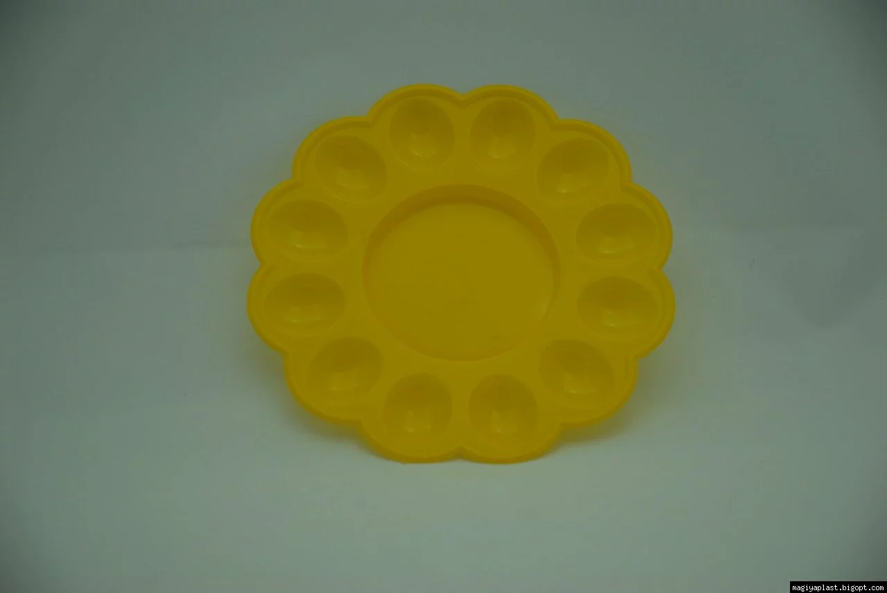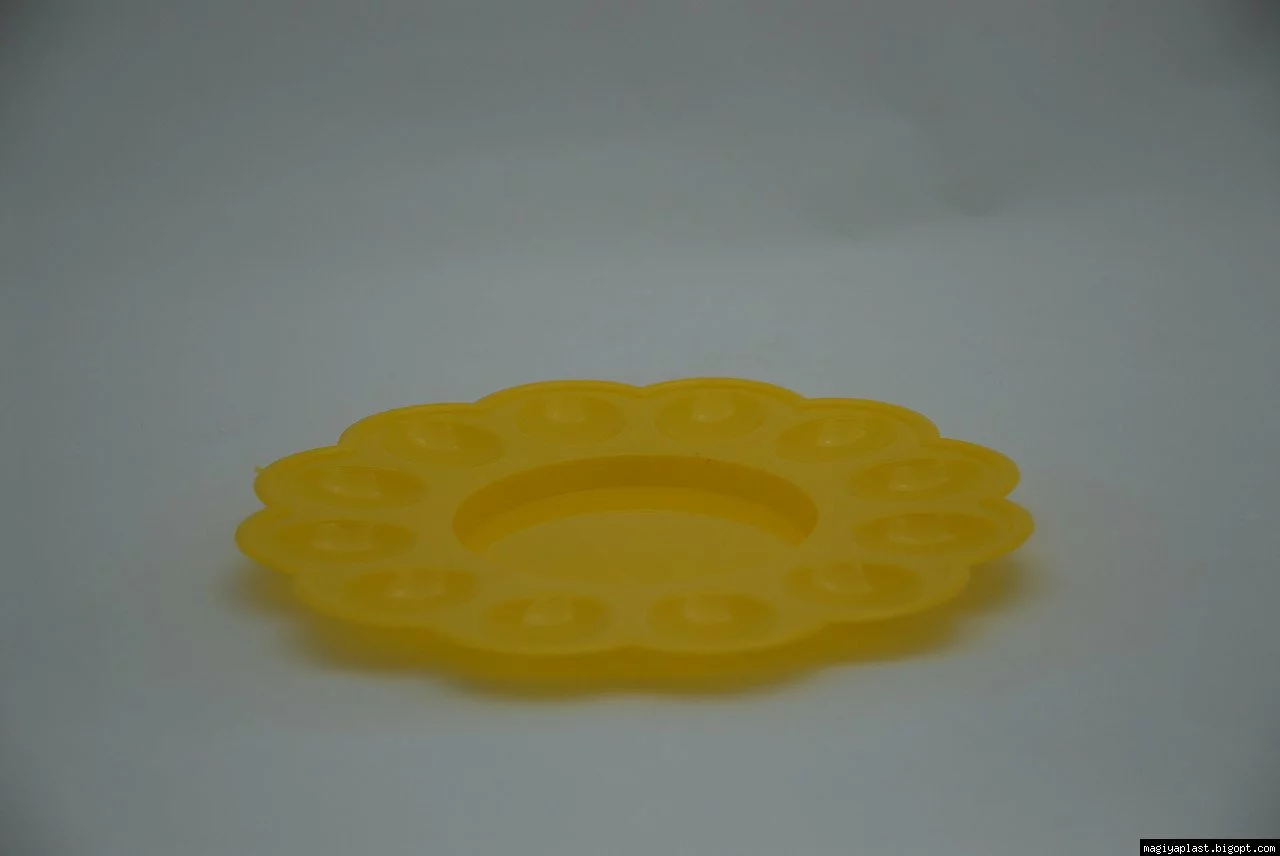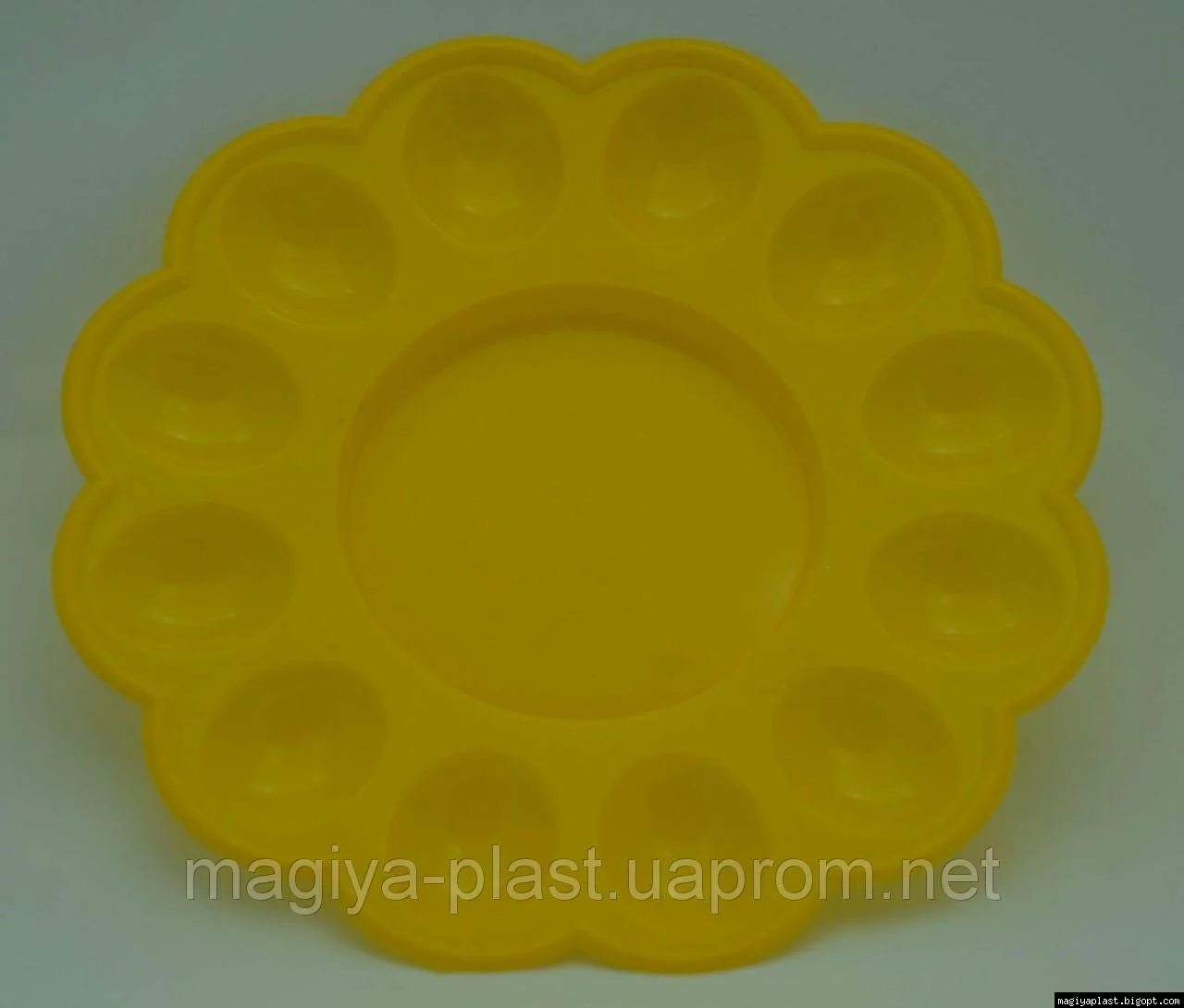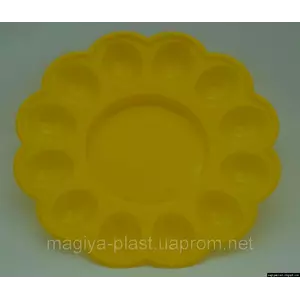 Пасхальная пластмассовая фигурная тарелка-подставка на 12 яиц и праздничный кулич изготовлена из смеси на базе полипропилена, и предназначена для использования в качестве кухонной утвари. Диаметр внутренней ячейки около 11см, соответственно изделие подходит для использования как подставка для кулича-паски до Ø11см, и дюжины пасхальных крашеных яиц (писанок) по краям. Изделие, благодаря своему специальному дизайну, так же, подходит для подачи других блюд из яиц.