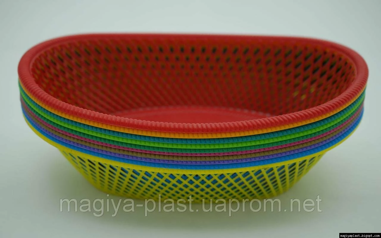 Пластиковая овальная корзинка для фруктов изготовлена из смеси на базе полипропилена, и предназначена для использования в качестве кухонной утвари. Изделие подходит для хранения конфет, фруктов, овощей, и непродолжительное время.