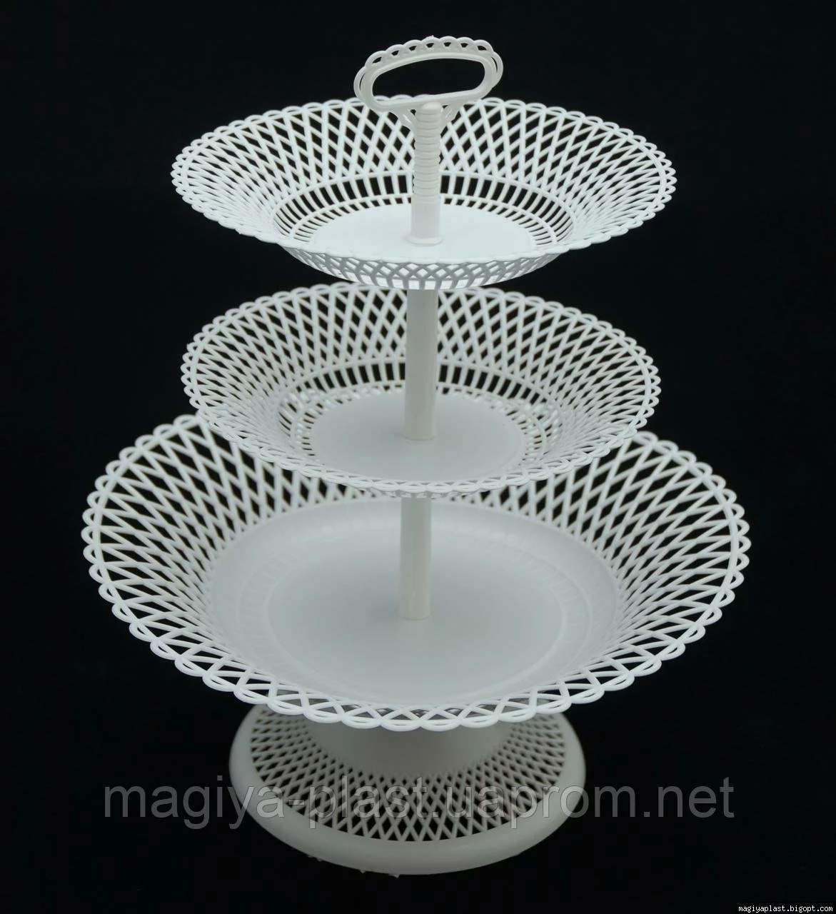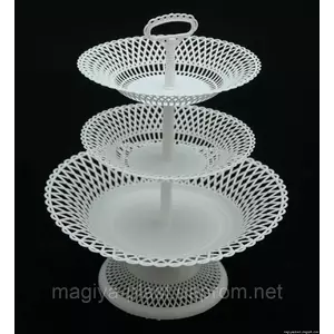 Пластиковая круглая с тремя ярусами предназначена для использования в качестве кухонной утвари. Изделие подходит для подачи на стол, либо кратковременного хранения хлебобулочных изделий, конфет, и фруктов.