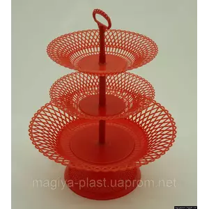 Пластиковая круглая с тремя ярусами предназначена для использования в качестве кухонной утвари. Изделие подходит для подачи на стол, либо кратковременного хранения хлебобулочных изделий, конфет, и фруктов.