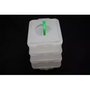 Набор прямоугольных пластиковых контейнеров в виде тройного лотка-органайзера с крышкой предназначен для использования в качестве кухонной утвари, как вспомогательное средство при хранении, транспортировке, и приготовлении разнообразной еды и полуфабрикатов. Крышка прилегает к контейнеру-лотку плотно, но не герметично, а сам контейнер-лоток является очень практичной вещью благодаря специальному дизайну, позволяющему защёлкивать контейнеры друг на друге, вследствие чего, верхний контейнер служит крышкой нижнему. Гладкая внутренняя поверхность набора прямоугольных пластиковых контейнеров в виде тройного лотка-органайзера с крышкой позволит легко ухаживать за изделием.