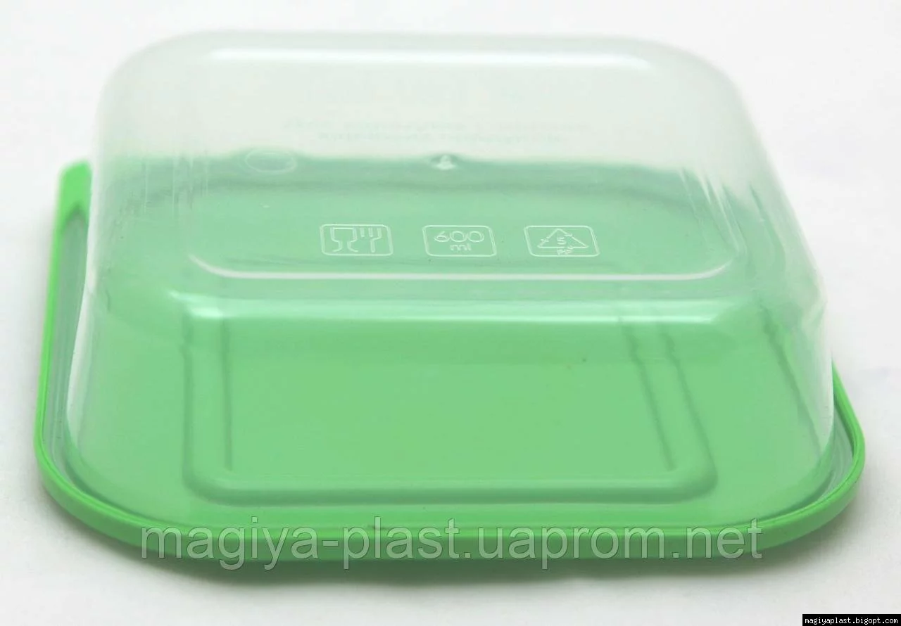 Пластиковый квадратный контейнер-лоток 0.6л с жесткой крышкой (разные цвета крышки)
