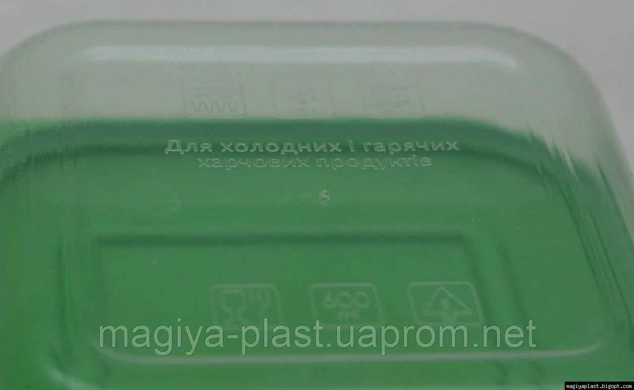 На дне пластикового квадратного контейнера-лотка 0.6л есть маркировка с данными о материале изготовления изделия, его номинальном объеме, и прочими свойствами. Мытьё в посудомоечной машине рекомендовано в щадящем режиме. Использование в микроволновой печи рекомендовано с приоткрытой крышкой, и на малой либо средней мощностях в течении не более 1-3 минут. В морозильной камере рекомендовано использовать с осторожностью.