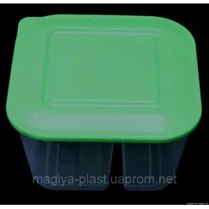 Пластиковый квадратный контейнер-лоток 0.8л на две секции с жесткой крышкой предназначен для использования в качестве кухонной утвари, как вспомогательное средство при хранении, транспортировке, и приготовлении разнообразной еды и полуфабрикатов. Крышка прилегает к контейнеру-лотку плотно, но не герметично, и, благодаря специальному дизайну, легко удобно открывается, а сам контейнер-лоток является очень практичной вещью благодаря двум глубоким секциям. Гладкая поверхность пластикового квадратного контейнера-лотка 0.8л на две секции с жесткой крышкой позволит легко ухаживать за изделием.