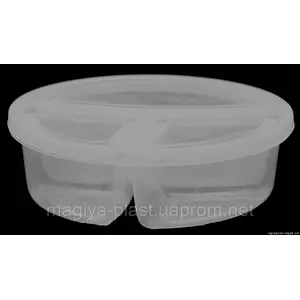 Пластиковый круглый тройной контейнер (лоток) 1.25л "Менажница" предназначен для использования в качестве кухонной утвари, как вспомогательное средство при хранении, транспортировке, и приготовлении разнообразной еды и полуфабрикатов. Допускается использование в качестве хозяйственного инвентаря в домашнем хозяйстве. Крышка прилегает к контейнеру (лотку) плотно, но не герметично, и, благодаря специальному дизайну, легко удобно открывается, и изделие является очень практичной вещью благодаря низкому борту и трем отдельным секциям разных объемов. Гладкая поверхность пластикового круглого тройного контейнера (лотка) 1.25л "Менажница" с жесткой крышкой позволит легко ухаживать за изделием.