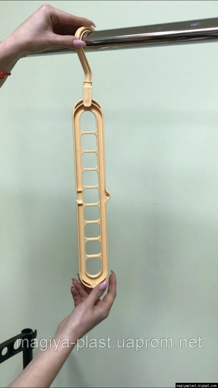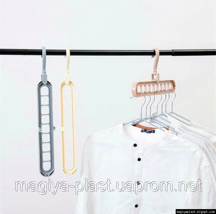 Эта вешалка просто создана для того, чтобы сохранить как можно больше свободного места у Вас в гардеробе. Трансформер замечательно подходит для размещения рубашек, футболок или легких летних платьев. Всего лишь одна вешалка способна заменить целых 9 вешалок! Благодаря крючку, который оборачивается на 360° Вы сможете использовать её в разных вариантах. Переходничок, который двигается по корпусу вешалки позволит Вам хранить вещи как вертикально так и горизонтально.