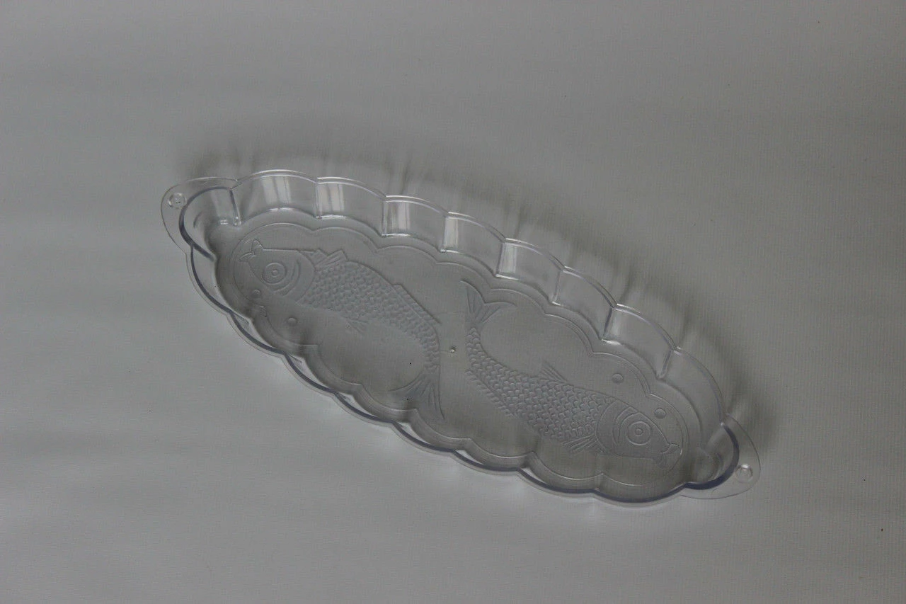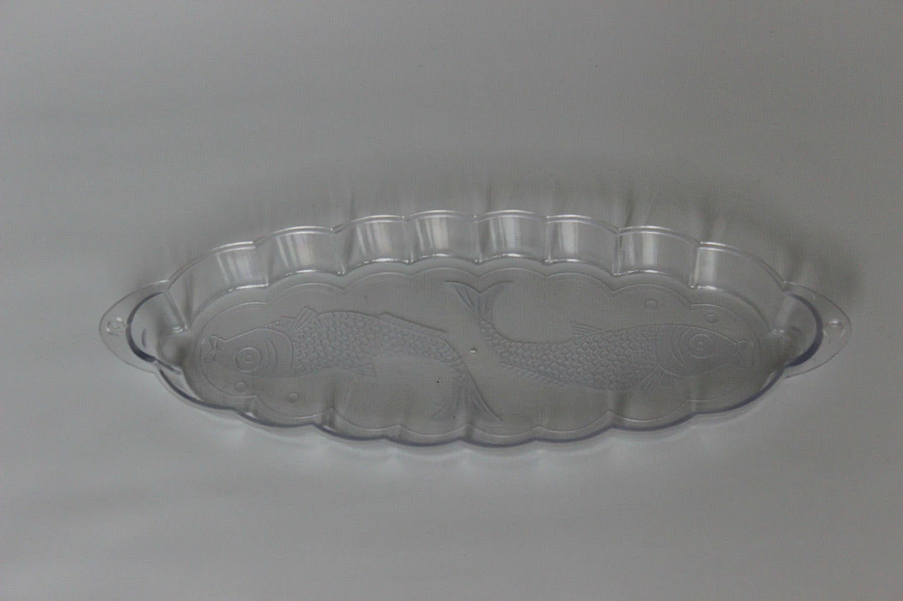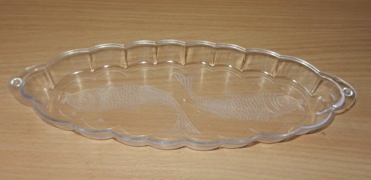 На дне пластмассовой овальная фигурная тарелка для подачи блюд из рыбы 26см х 10см маркировка отсутствует. Мытьё в посудомоечной машине рекомендовано в щадящем режиме. Не рекомендуется использовать в микроволновой печи. Не рекомендуется использовать в морозильной камере.