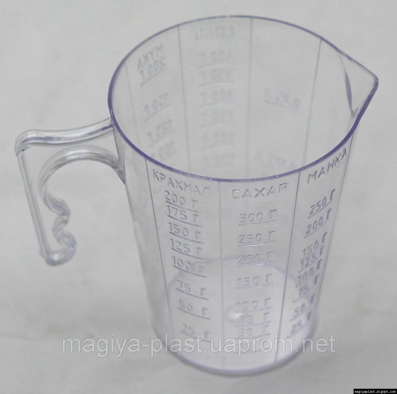 полистирольный 300мл с анатомической ручкой изготовлен из полистирола, и предназначен для использования в домашнем хозяйстве в качестве кухонной утвари. Допускается использование в качестве кухонной утвари в организациях и учреждениях. Не является профессиональным измерительным прибором. Мерные шкалы вылиты с наружной стороны изделия, а внутренняя гладкая поверхность позволит легко ухаживать за изделием. С помощью мерного стакана полистирольного 300мл с анатомической ручкой можно быстро и удобно отмерить необходимое количество сыпучих: крахмала, сахара, манки, соли, и муки, а, так же, отмерять необходимое количество прохладной жидкости. Благодаря специальному анатомическому дизайну ручки изделие удобно держать одной рукой, а благодаря материалу изготовления, изделие обладает немного большей прозрачностью, нежели .