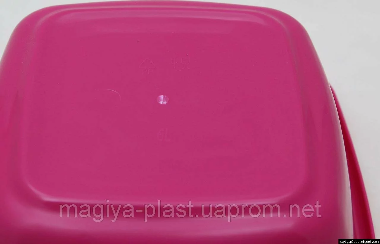 На дне пластикового квадратного таза 6 л есть маркировка с данными о его номинальном объеме, и некоторыми другими свойствами. В случае использование в качестве кухонной утвари, мытьё в посудомоечной машине рекомендовано в щадящем режиме, а использование в микроволновой печи рекомендовано на малой и средней мощностях в течении не более 1-3 минут.