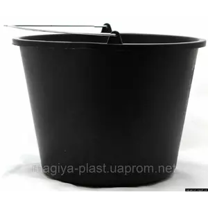 Круглое хозяйственное (строительное) 14л изготовлено из смеси на базе переработанных полимеров: полипропилен и полиэтилен в разных пропорциях. Возможны примеси других полимеров. Некоторая степень эластичности корпуса круглого хозяйственного (строительного) ведра 14л из переработанного пластика с мерной шкалой достигается благодаря присутствию полиэтилена в составе смеси переработанных полимеров, из которой изготавливается корпус изделия. Степень эластичности напрямую зависит, так же, от точного состава этой полимерной смеси, и может меняться как в рамках одной партии производства, так и от партии к партии в значительной степени. Ручка изделия изготовлена из оцинкованной проволоки 3,5мм..4,0мм, и имеет характерный носик посередине. Внутри круглого хозяйственного (строительного) ведра 14л нанесена мерная шкала до 13 литров (номинальный объём 14л может быть достигнут, если заполнить изделие водой до краёв). Не является профессиональным измерительным прибором. На дне изделия с наружной стороны присутствуют небольшие рёбра жесткости.