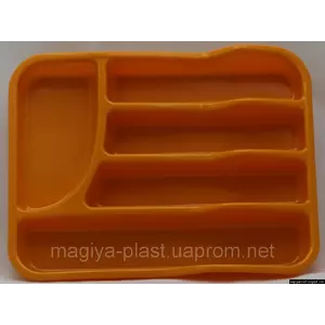 Пластиковый прямоугольный лоток-вкладыш в шуфлядку для столовых приборов изготовлен из смеси на базе полипропилена, и предназначен для использования в качестве кухонной утвари. Изделие подходит для эргономичного хранения столовых приборов в шуфлядке. Столовые приборы рекомендовано укладывать в ниши пластикового лотка-вкладыша в шуфлядку, с учётом их дизайна, в стопки, не превышающие высоту ниш. Рекомендовано для хранения чистых сухих столовых приборов.