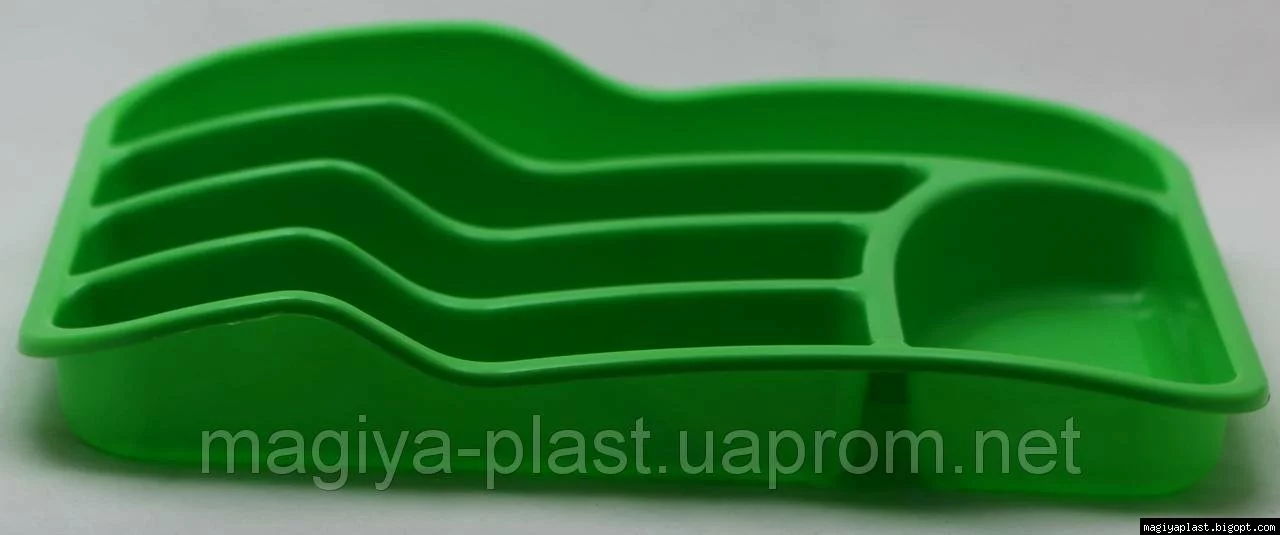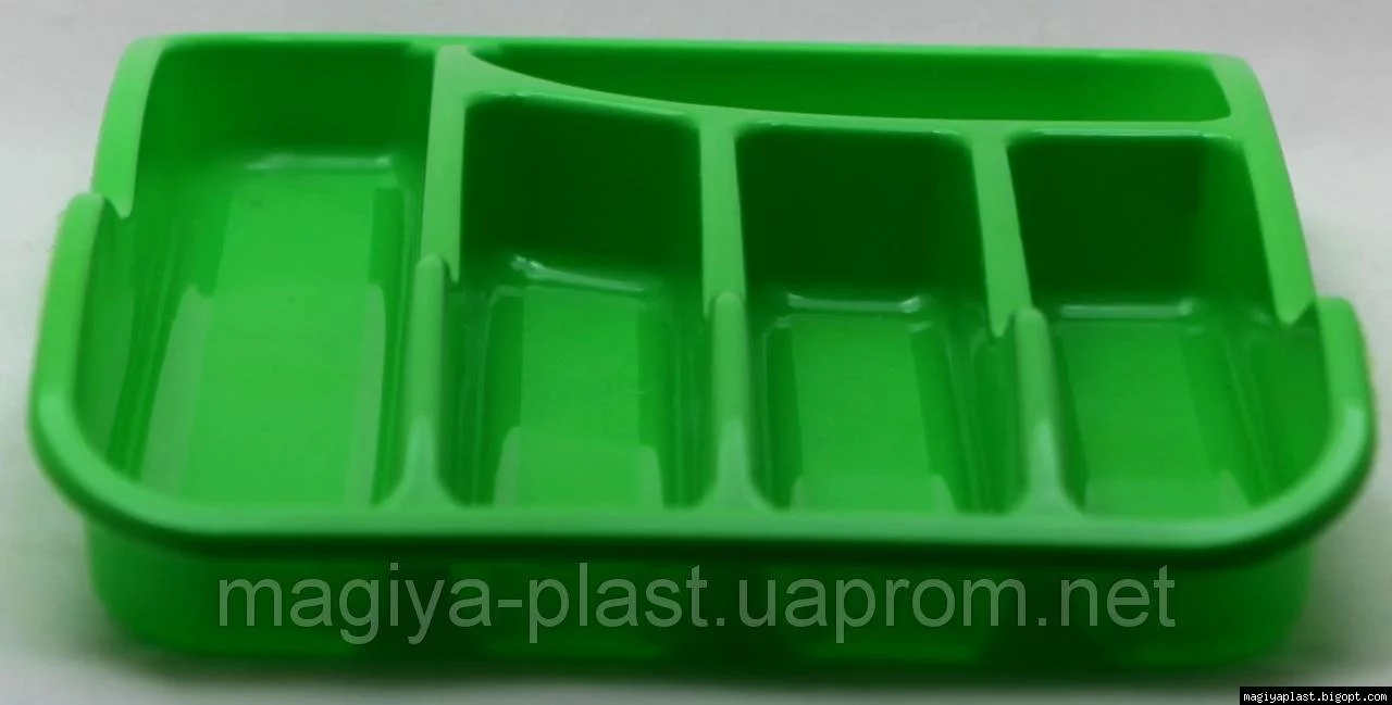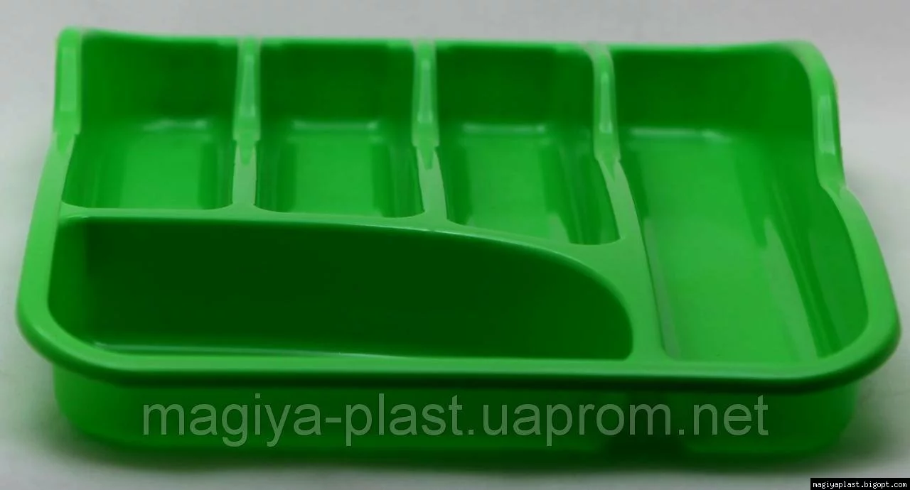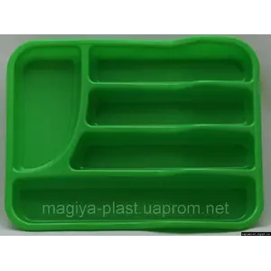 Пластиковый прямоугольный лоток-вкладыш в шуфлядку для столовых приборов изготовлен из смеси на базе полипропилена, и предназначен для использования в качестве кухонной утвари. Изделие подходит для эргономичного хранения столовых приборов в шуфлядке. Столовые приборы рекомендовано укладывать в ниши пластикового лотка-вкладыша в шуфлядку, с учётом их дизайна, в стопки, не превышающие высоту ниш. Рекомендовано для хранения чистых сухих столовых приборов.